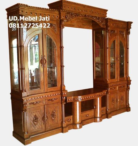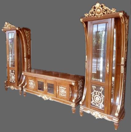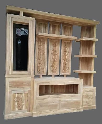 Bufet TV ce Ukuran 300x60x210 cm Finishing natural jati + emas Harga Rp 10.500.000 |